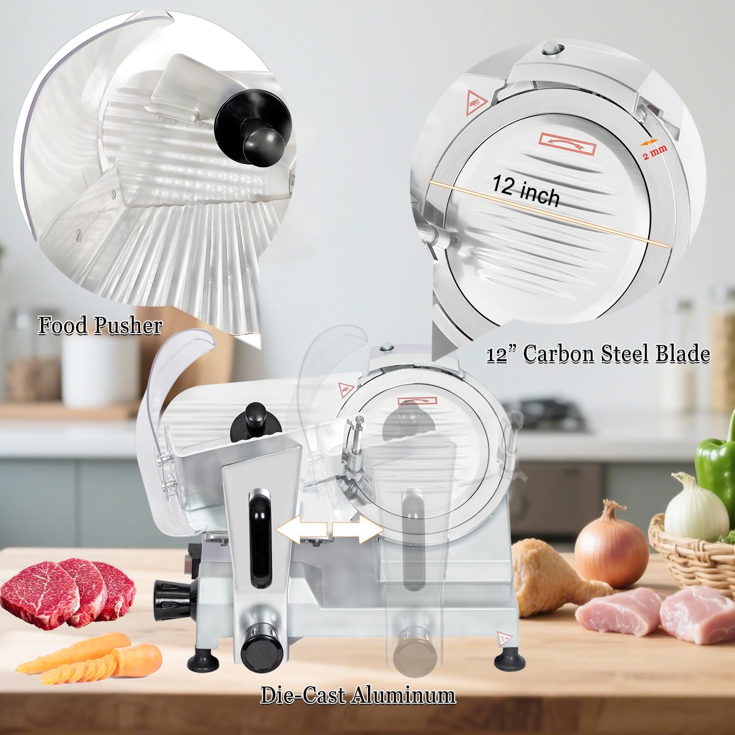- Premium Materials for Superior Durability: This commercial meat slicer boasts a die-cast aluminum body and 12-inch carbon steel blade. Made with high-quality materials, it delivers strong rust and corrosion resistance. The blade stays exceptionally sharp for faster, more efficient cutting—ensuring long-term stable performance. (Note: The meat slicer produces operational noise, with a sound level below 55 decibels.)