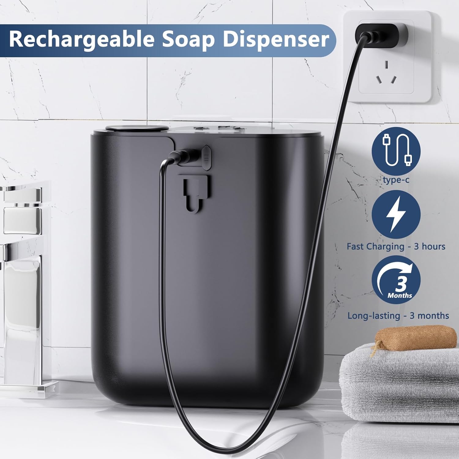 - Efficient Power Design: Featuring a USB Type-C charging port and a powerful 1200 mAh rechargeable battery, this automatic soap dispenser can be fully charged in just 3 hours and supports up to 5000 cycles of operation on a single charge, ensuring long-lasting performance and convenience.
