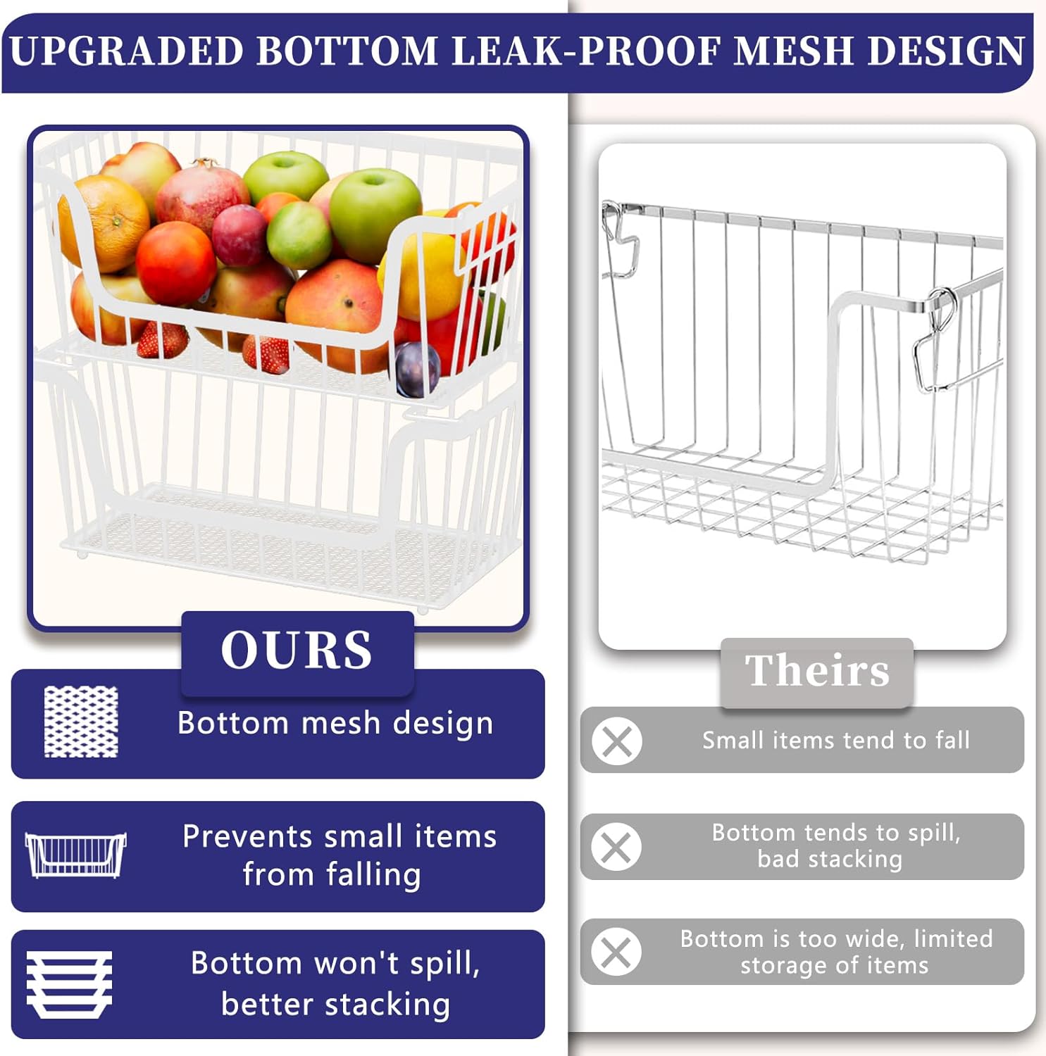 - LEAK-PROOF MESH DESIGN AT THE BOTTOM: To prevent small items from falling and bottom items from spilling out, baskets for shelves feature an upgraded sturdy mesh design at the bottom. This effectively ensures that your items stay organized and safe. The non-slip beads on the bottom of the stackable metal basket enhance stability and are perfect for stacking.