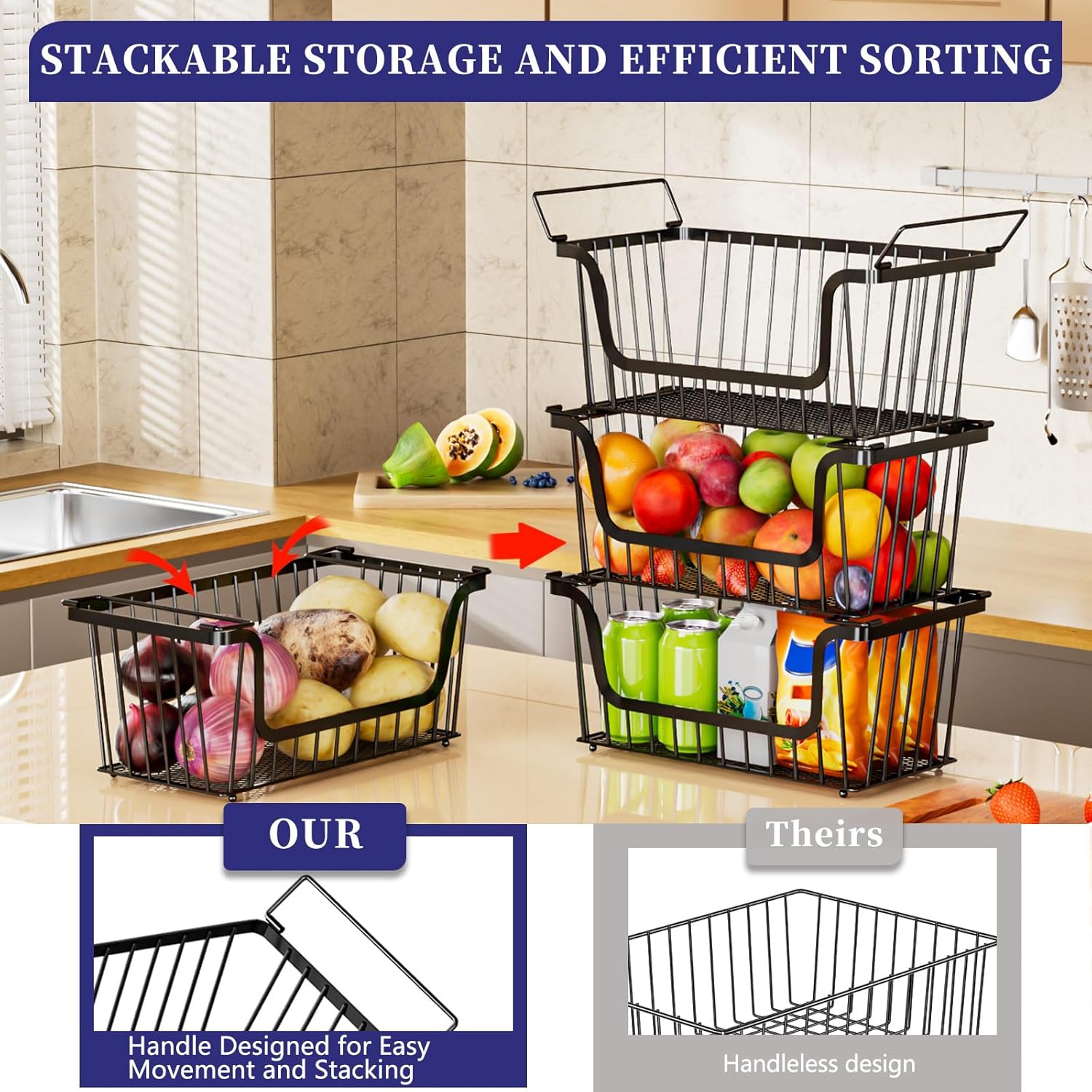 - FOCUS ON QUALITY AND YOUR EXPERIENCE: The edges of each stackable fruit basket are made with anti-scratch treatment, and the surface is reinforced with corrosion-resistant black powder coating, which effectively prevents rust and achieves a durable effect. We take your experience very seriously, so please feel free to use it.