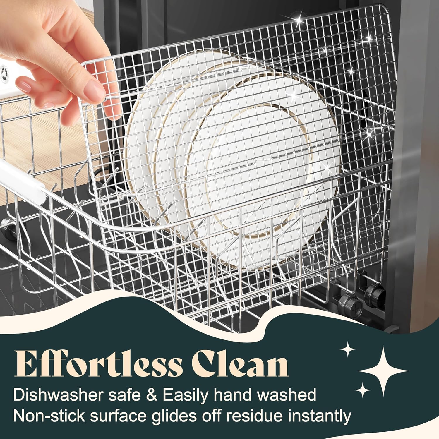 - DISHWASHER & OVEN SAFE: Our baking rack not contain metal plating or coating, making it dishwasher safe and also easy to hand wash. At the same time, the superior material allows stainless steel cooling racks to heat resistant up to 575°F, so than can used with confidence to roast, bake, grill, smoke, and dry with confidence