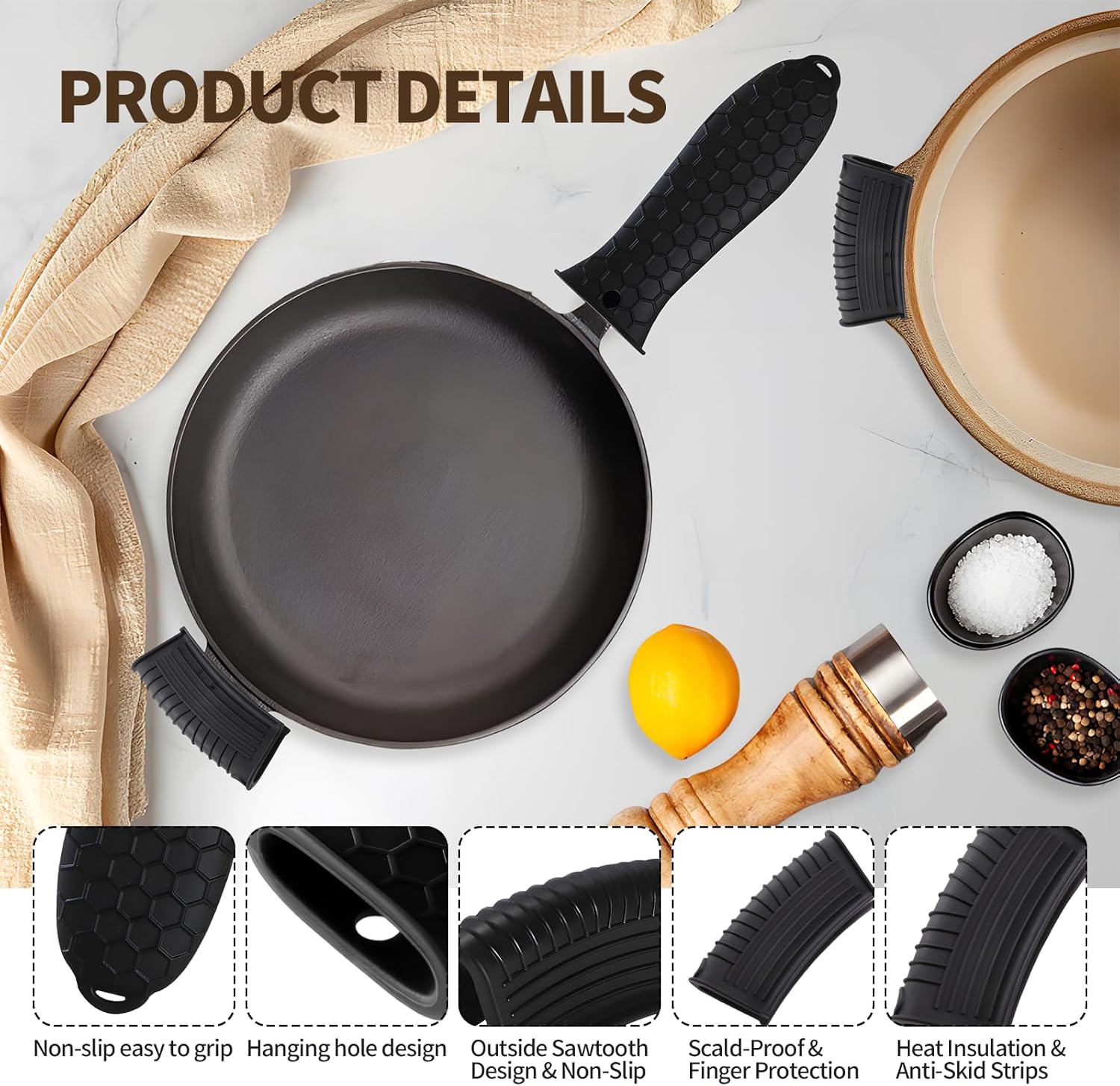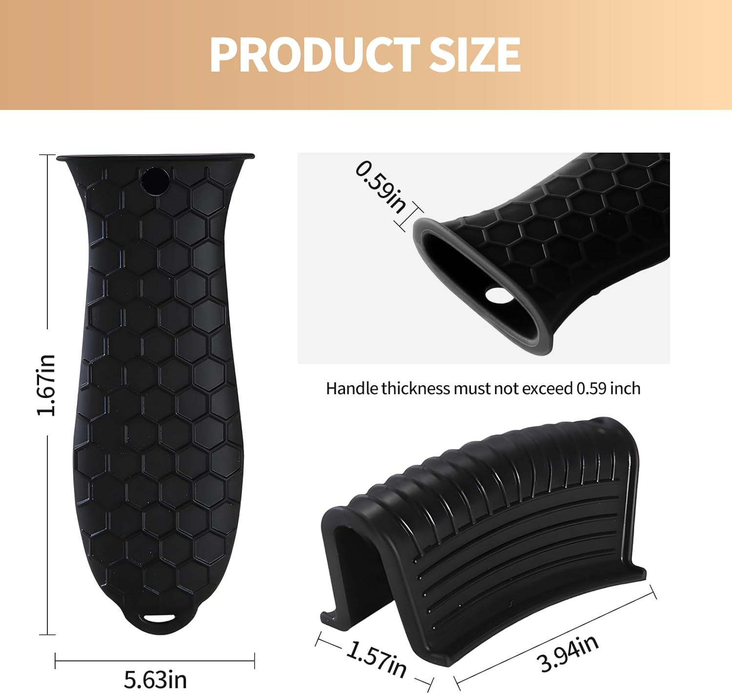 - Universal Size Design: The large handle sleeve measures approximately 5.63×1.97 inches, while the small sleeves are 3.94×1.57 inches, fitting most cast iron skillets, Dutch ovens, enameled pots, copper pans, and baking trays. Ideal alternative to traditional pot holders and oven mitts. Note: Handle thickness must not exceed 0.59 inches.
