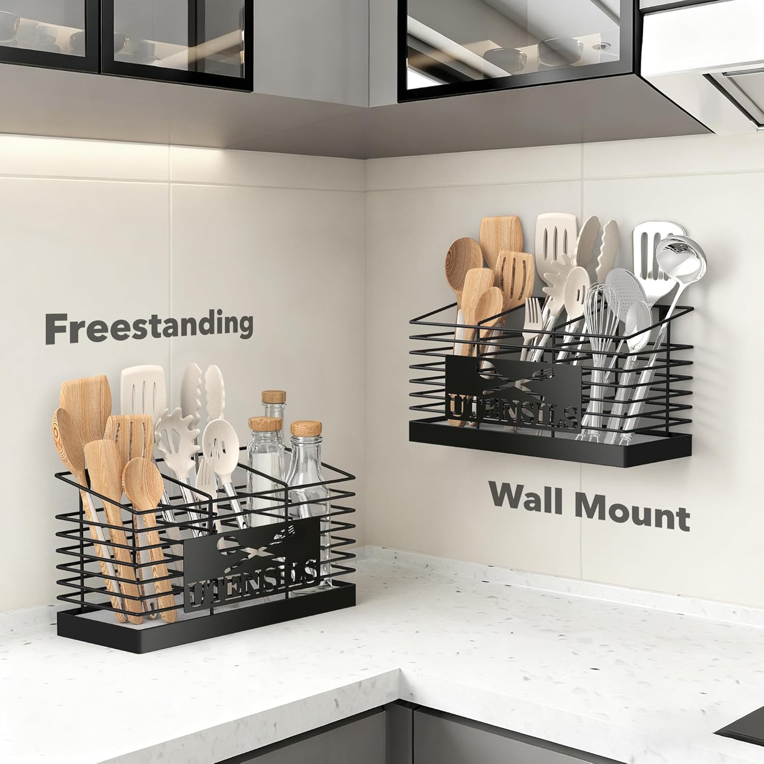 - Space-Saving and Versatile Placement: Maximize kitchen space by using this utensil caddy on countertops or mounting it on the wall with screws. Its compact design adapts to any layout, helping you organize cooking utensils without sacrificing style or functionality