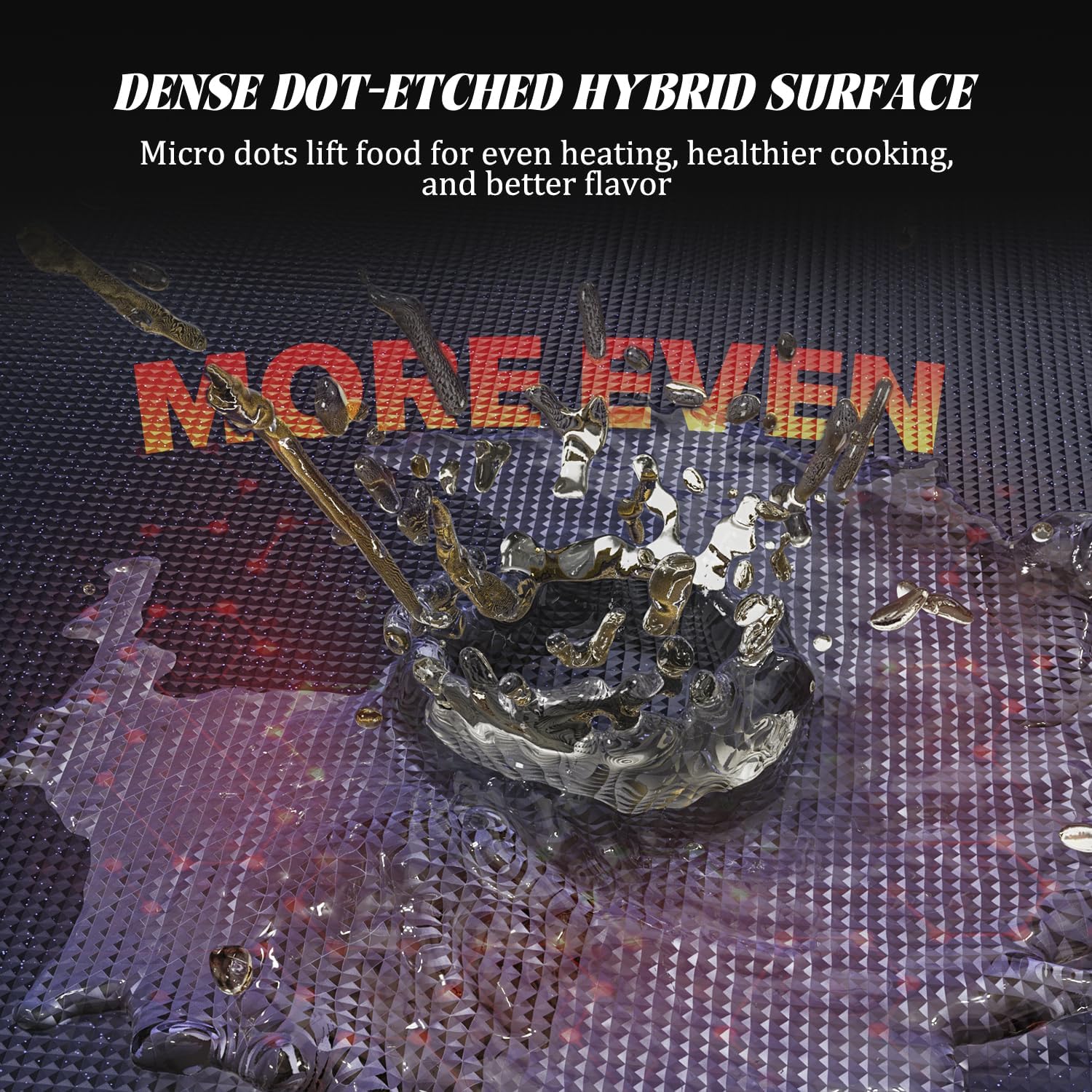 - Rapid & Even Heat Distribution: Built with a fully clad hybrid 3-ply stainless steel core and dual ceramic coating layers, this frying pan heats up quickly and distributes heat evenly across the entire cooking surface. The aluminum core, sandwiched between two layers of stainless steel, works with the dense dot-etched surface to promote micro-heat circulation—minimizing hot spots and enhancing flavor with every sear and sauté. Perfect for searing a steak to a crust while locking juices inside