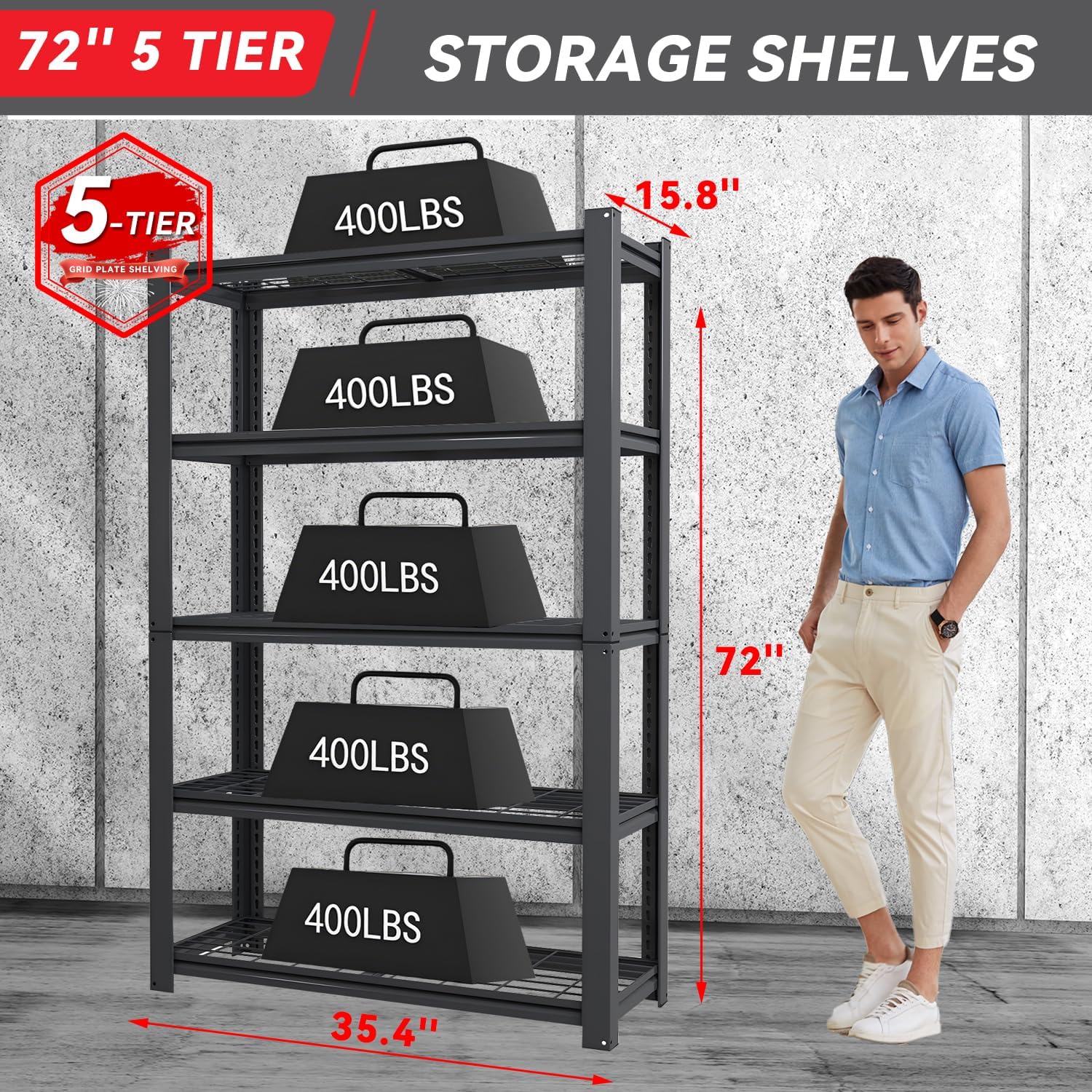 - Heavy-Duty Construction: Built with double-walled columns, this 5-tier shelving unit supports up to 400 lbs per shelf (1600 lbs total capacity). This shelving unit measures 35.4" W x 15.8" D x 72" H, perfect for storing tool, item, or holiday decoration
