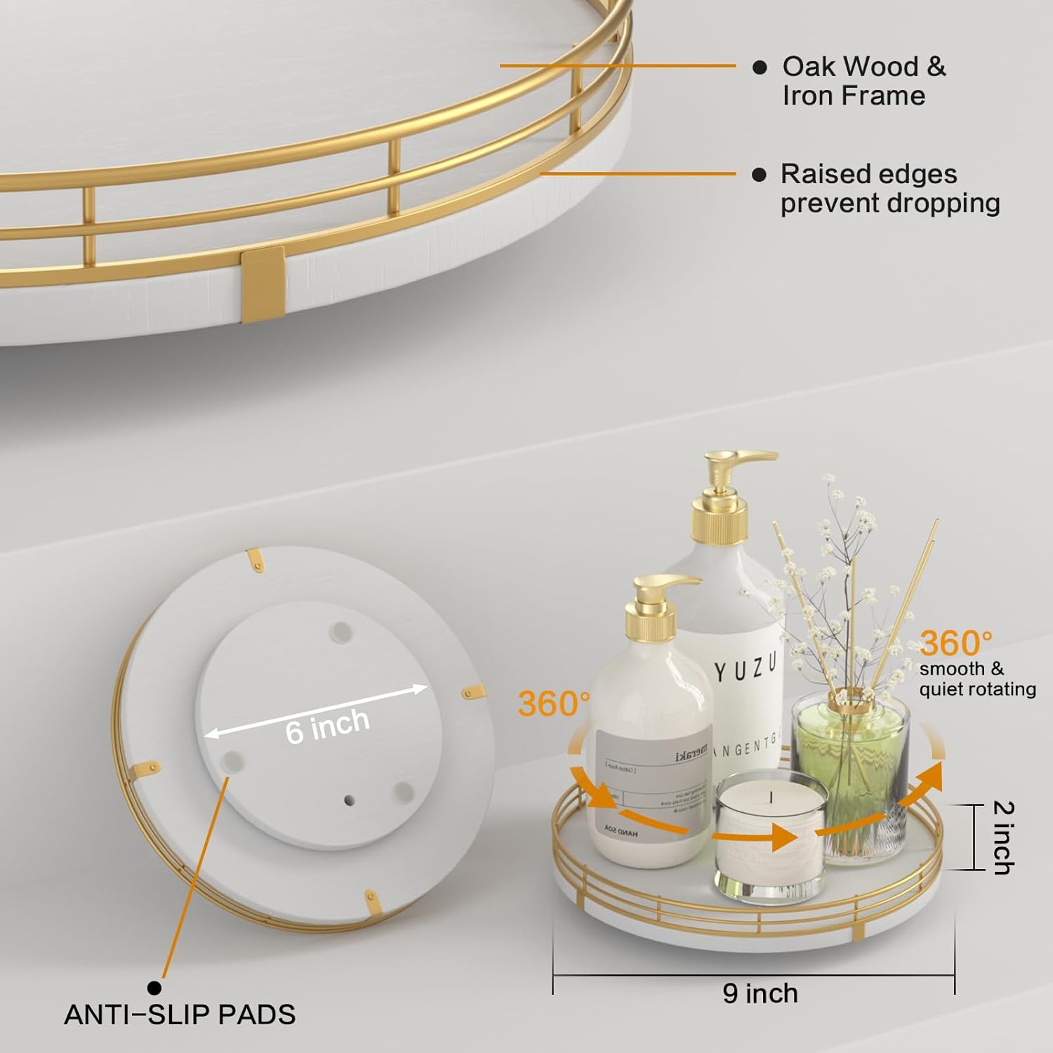 - 【Premium Oak Wood with Gold Metal Frame】Crafted from durable oak wood and a stylish iron-gold frame, this wooden lazy susan turntable adds both elegance and functionality to your home. Ideal as a wooden lazy susan for table top or a countertop lazy susan for kitchen decor.