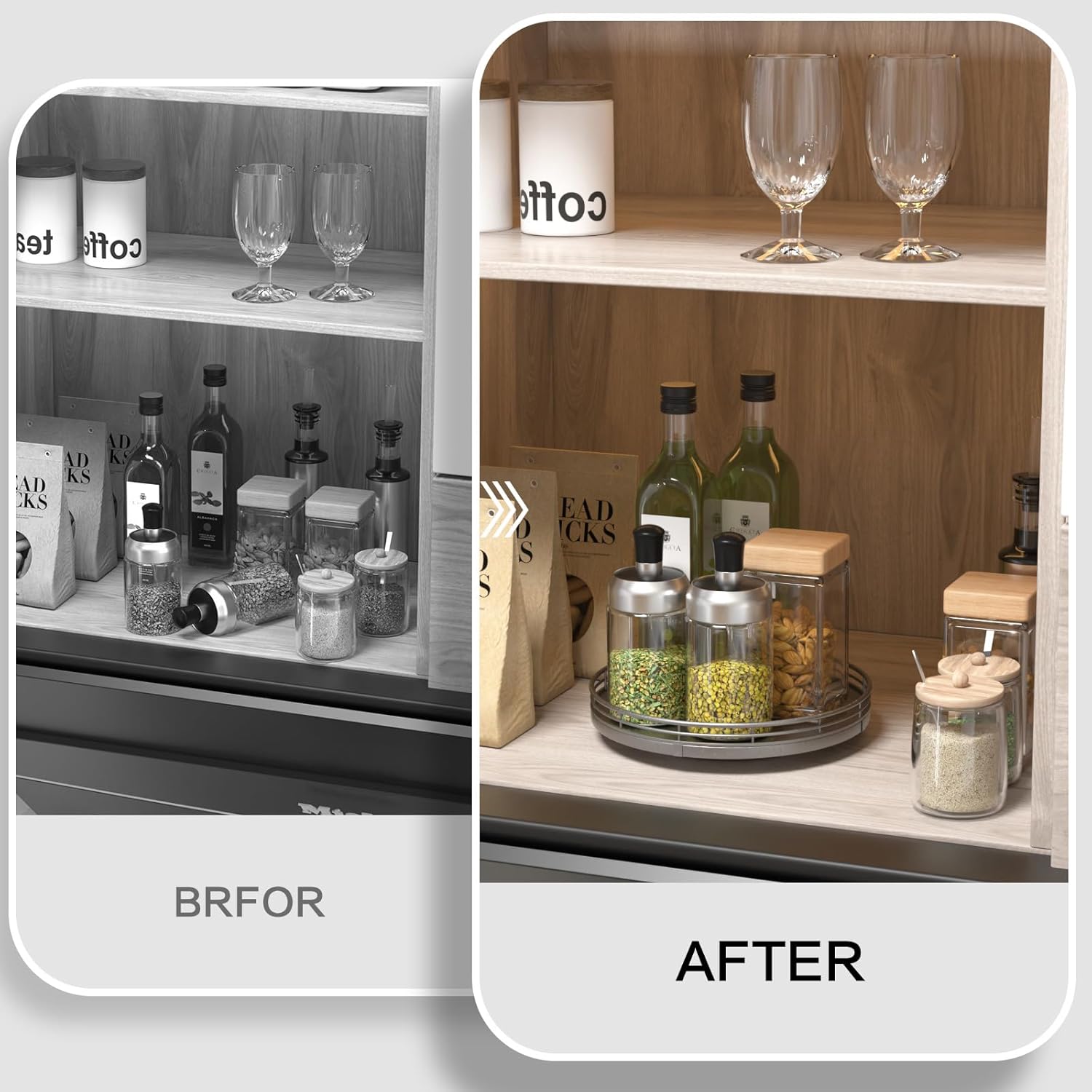 - Thoughtful Design: The turntable silver tray features a smooth and silent 360°rotation; Bottom slip-resistant pads for stability and protect your countertop from scratches; Raised edges on each organizer tray to keep items from falling out; Easy to use, no installation required