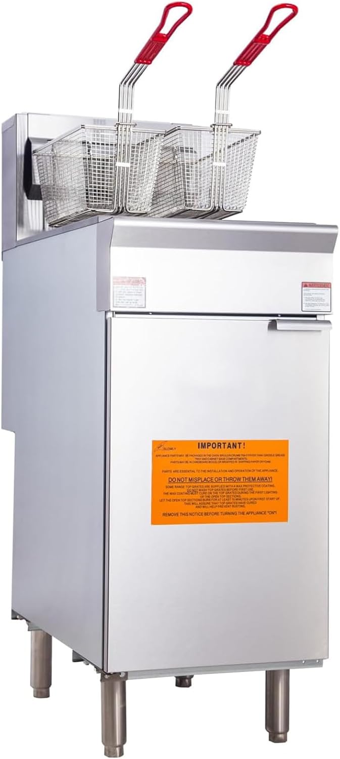 - Large Capacity - With overall dimensions of 30.12" x 15.57" x 45.75"(LxWxH) and a generous oil tank capacity of 45 - 55 pounds, this commercial natural gas fryer offers substantial cooking space. The smooth surface of the fryer, detachable basket hooks, and a drainage valve make cleaning and maintenance a breeze.