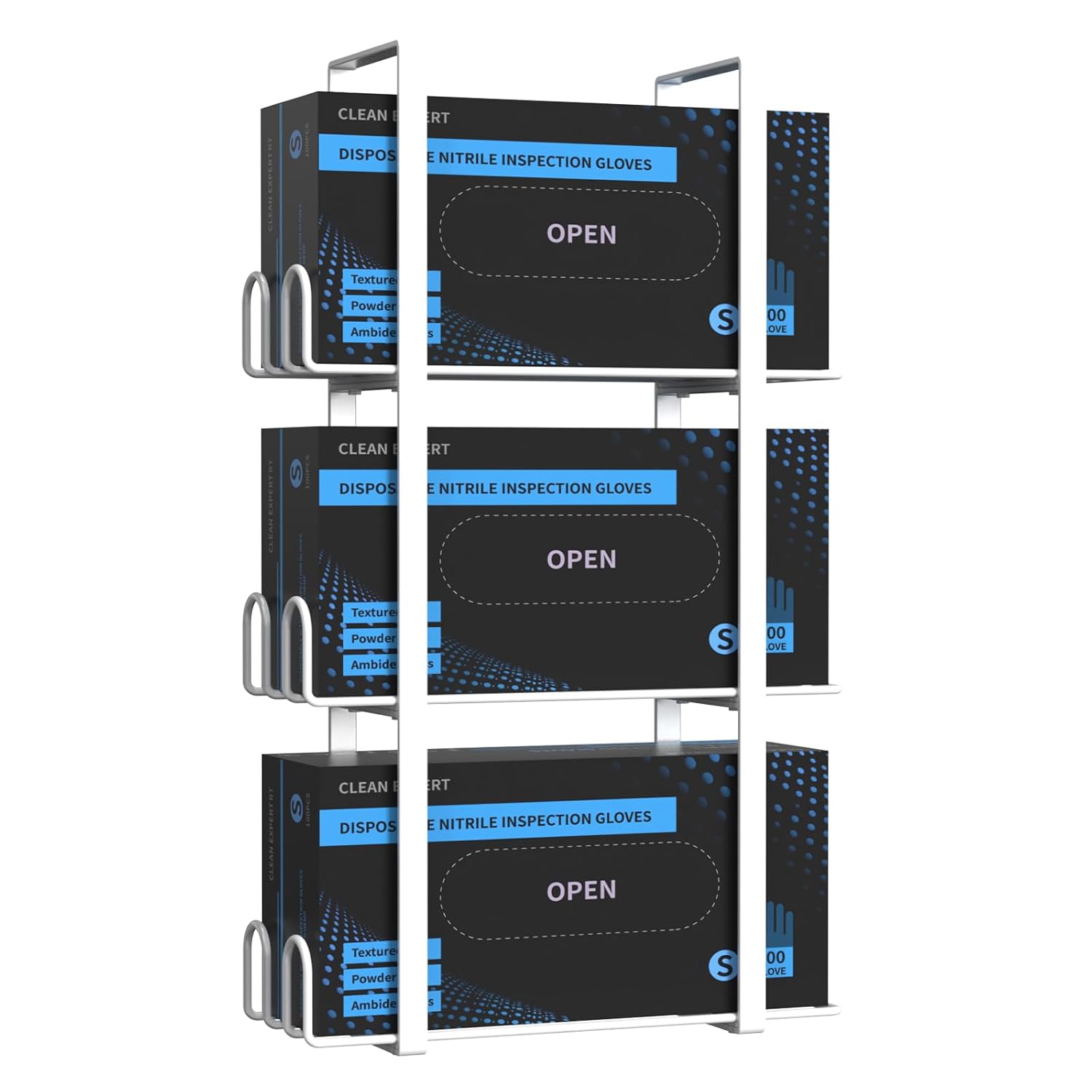 - SPACE SAVING AND ALL IN ONE PLACE - Our three-tier glove box holder, with a compact design, efficiently utilizes vertical space. Keeps your counter area clean, clutter-free, and maximizes functionality. The versatile design allows for the use of different sizes in one glove box holder.