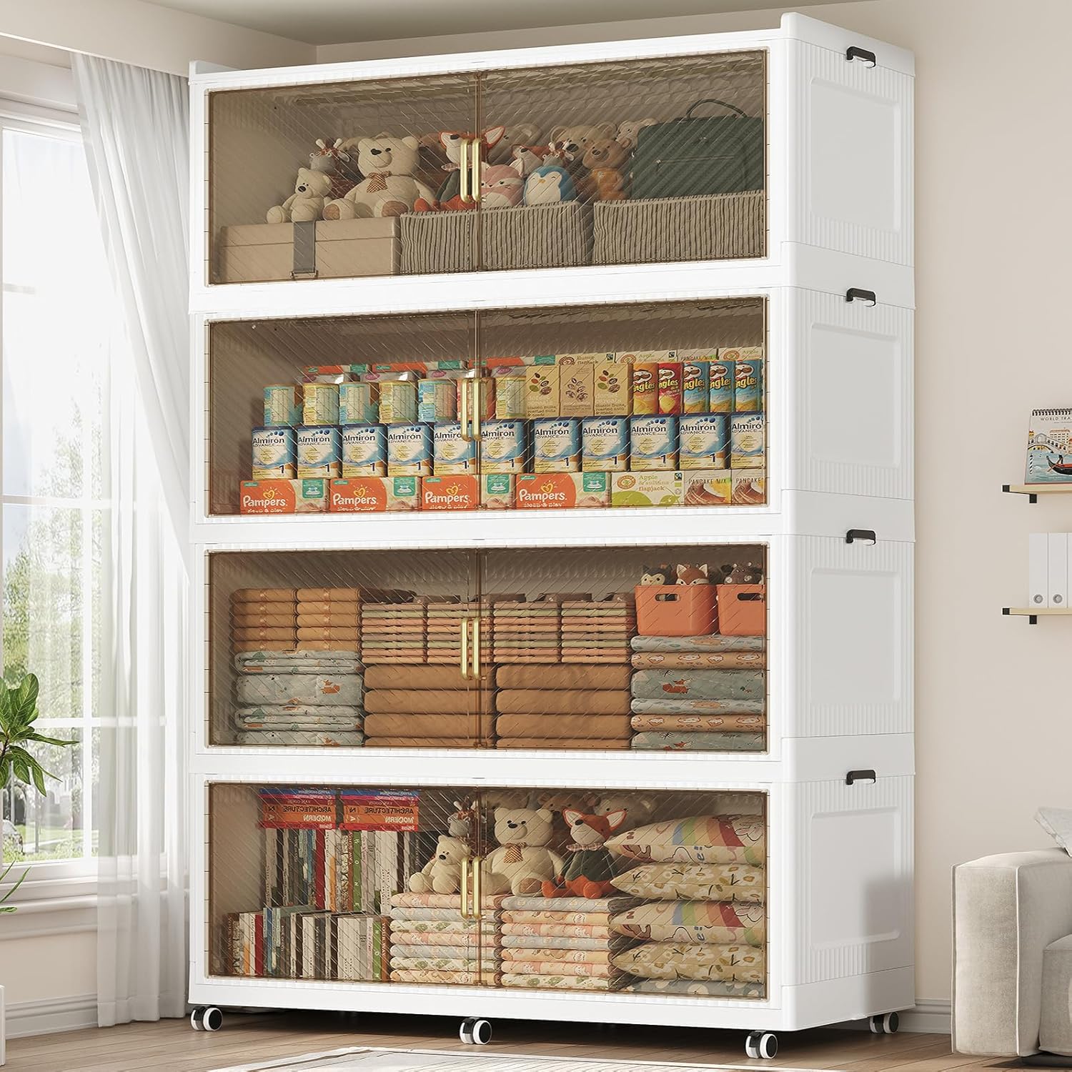 - 【Two Ways to Open & Magnetic Doors】The collapsible storage bins with lids and wheels feature a dual access way, allowing for both top and front door openings, and with clear brown windows for easy visibility. The super huge storage bins with open front doors are equipped with magnetic lock buckles to prevent dust from entering the cabinet.