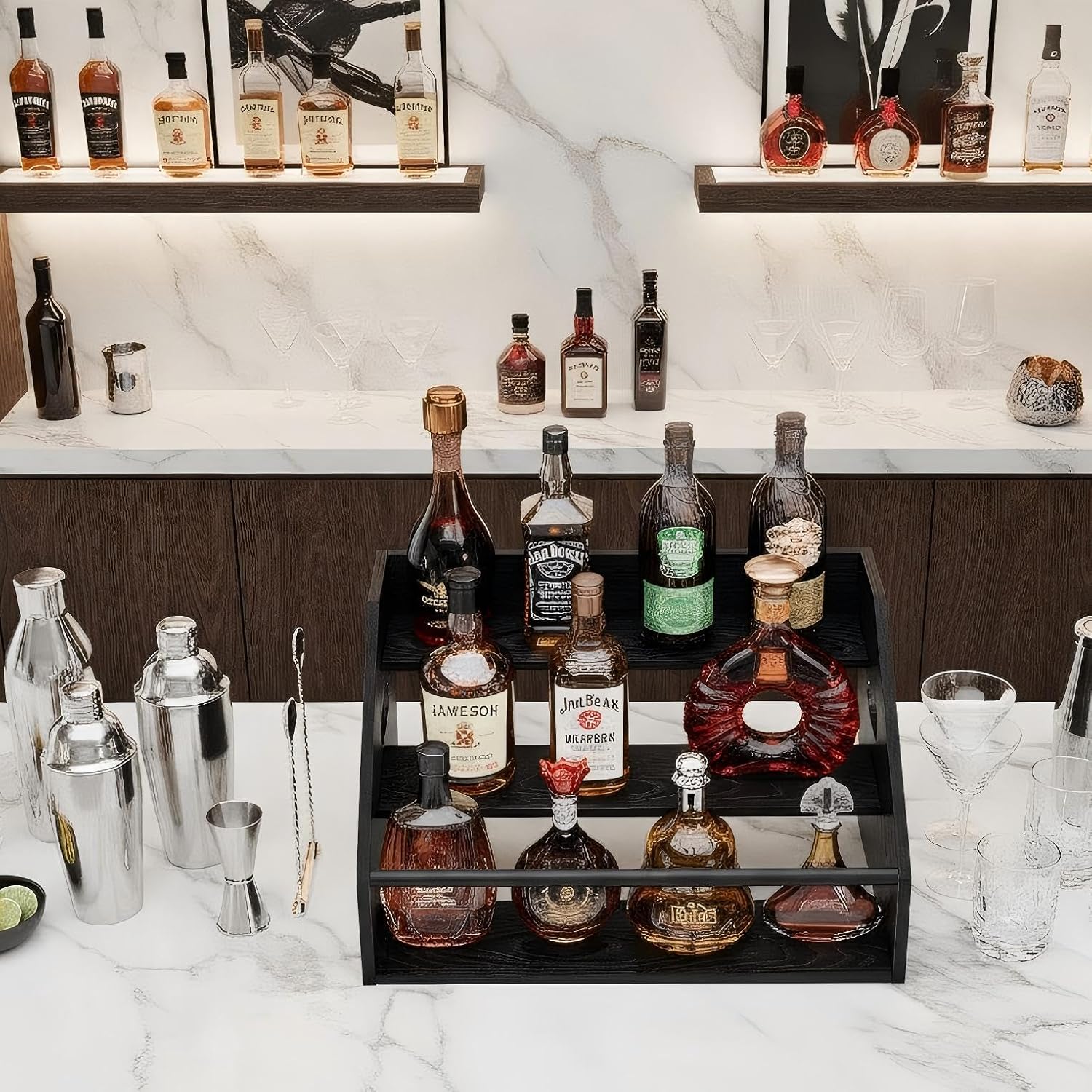 - Compact Yet Large Capacity Design – this 3 tier stepped bar bottle display shelf measures 16" × 11.8" × 9.25", holds up to 4 standard wine bottles per tier to maximize storage without crowding your countertop, and its tiered layout not only enhances the presentation but also makes bottles easier to access.