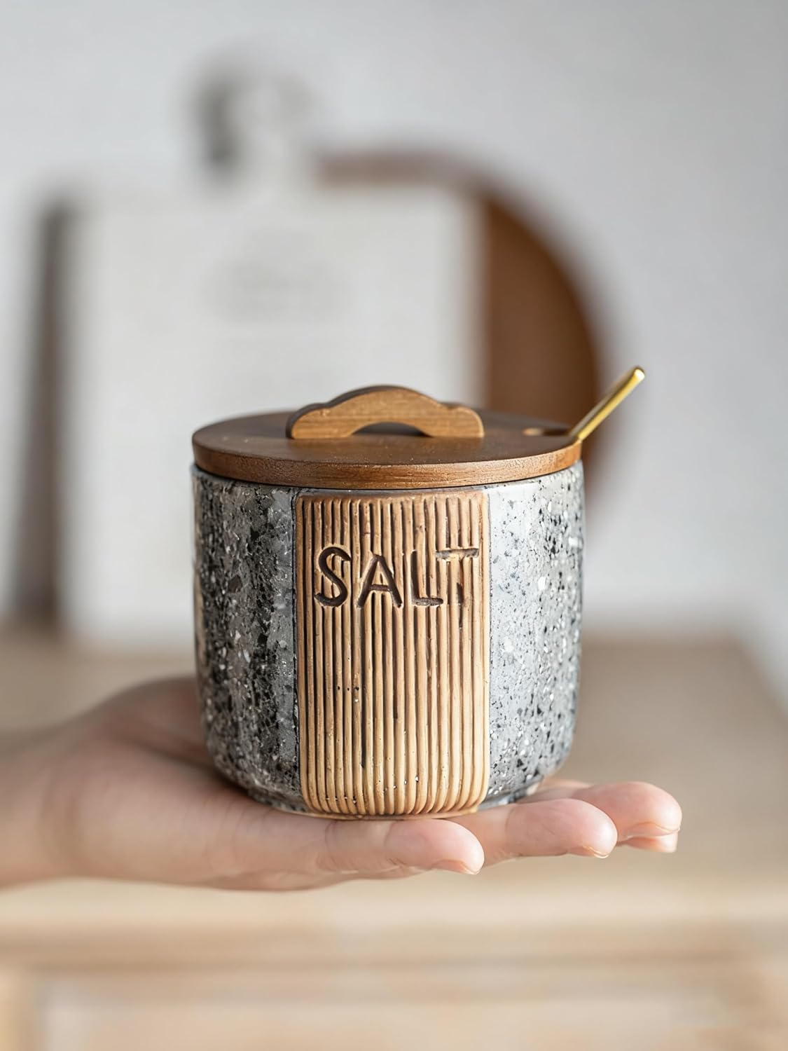 - This salt holder set includes a sleek wooden lid to keep your seasonings fresh and dry, along with a metal spoons for easy and precise dispensing. A perfect combination of style and functionality for your kitchen