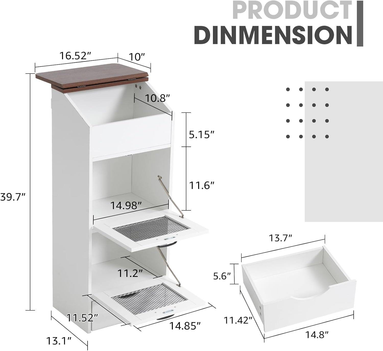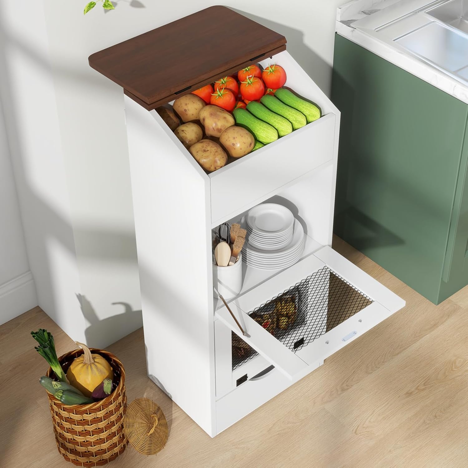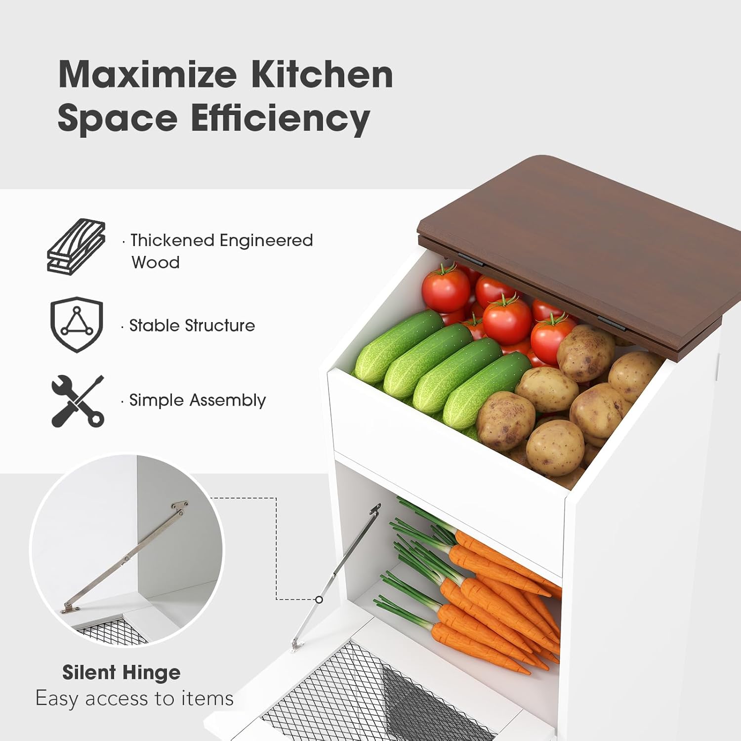 - 🏡️[Professional Grade Kitchen Storage Solution]: Crafted with premium P2 engineered wood, our potato storage bin combines durability with farmhouse elegance. The white frame with natural wood finish complements any kitchen style from modern to rustic, offering both functionality and aesthetic appeal.