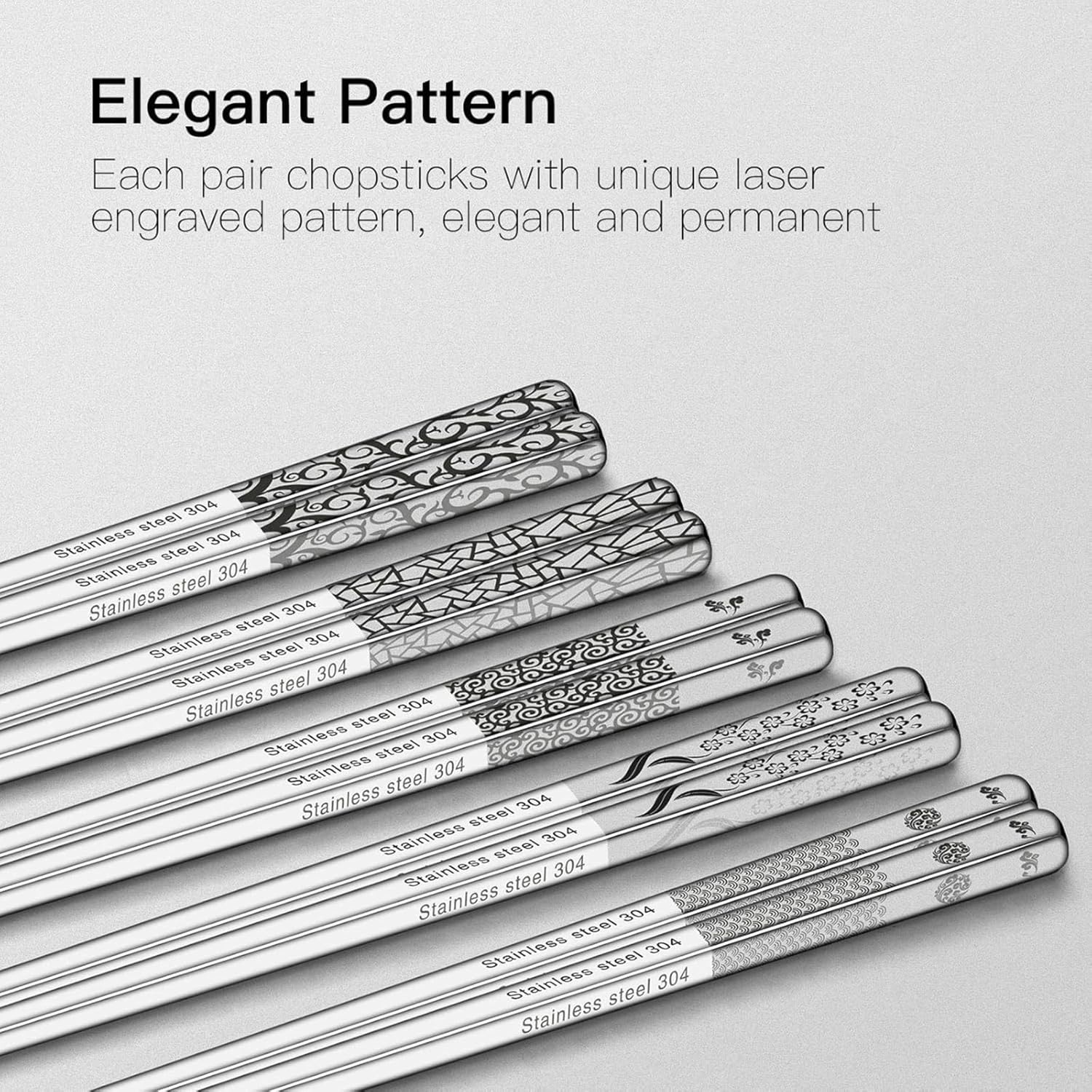 Metal Chopsticks Reusable 5 Pairs: Stainless Chopstick Set Dishwasher Safe,Non-Slip,Gift Box Packaging,Laser Engraved,Japanese Chinese Korean Chop Sticks for Cooking Eating - 5 Patterns
