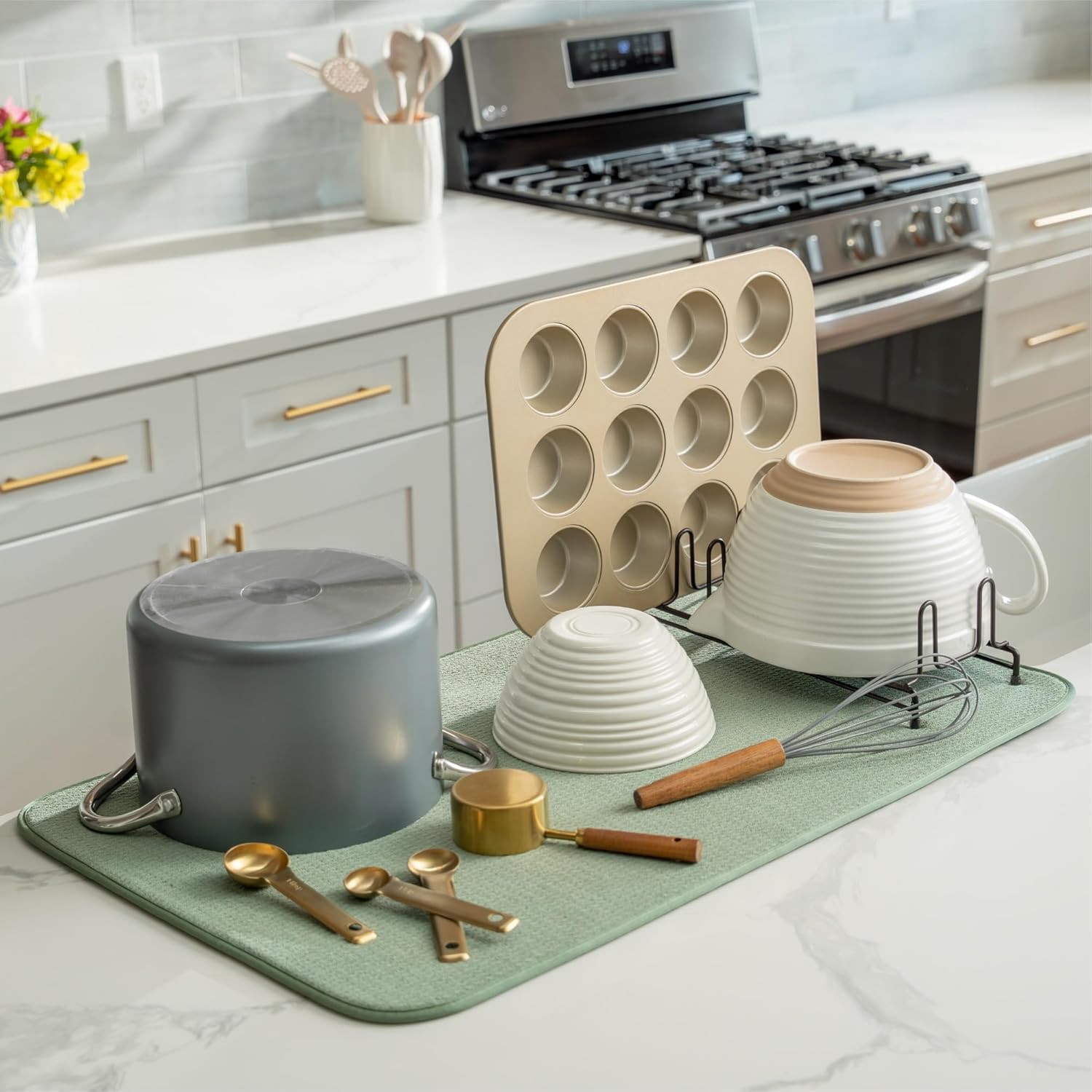 S&T INC. Dish Drying Mat Jumbo, 18” x 30”, Absorbent Microfiber Kitchen Counter Mat, Dish Drying Pad for Dishes, Utensils, Pots and Pans, Jumbo, Sage Green