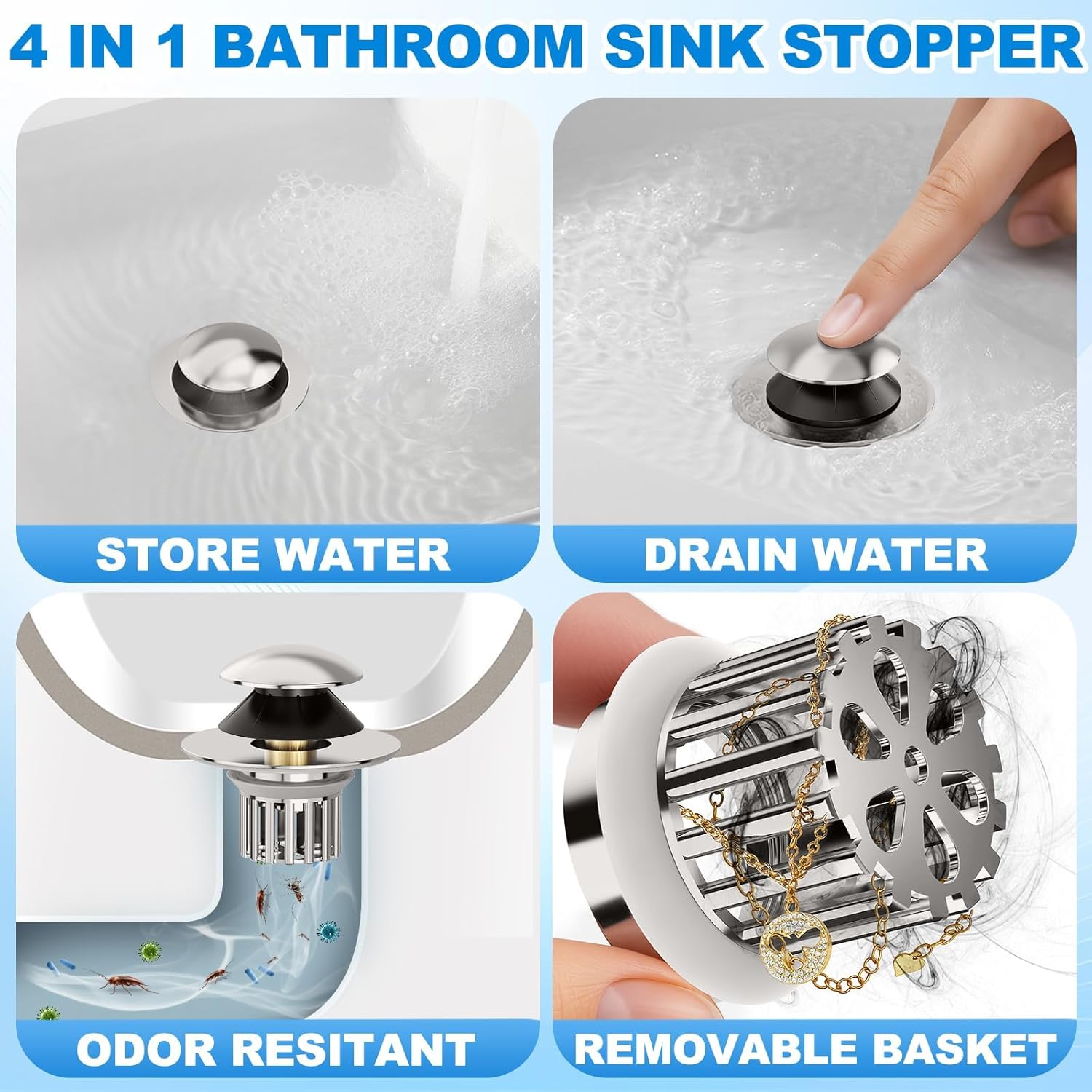 - 【4 IN 1 Design】Our sink stopper features a removable basket designed for two modes, With the basket in place, it effectively filters small items to prevent blockages. When removed, the sink strainer enables swift drainage through 4 holes. [ Please measure the sink drain hole diameter before purchasing to confirm a proper fit.]